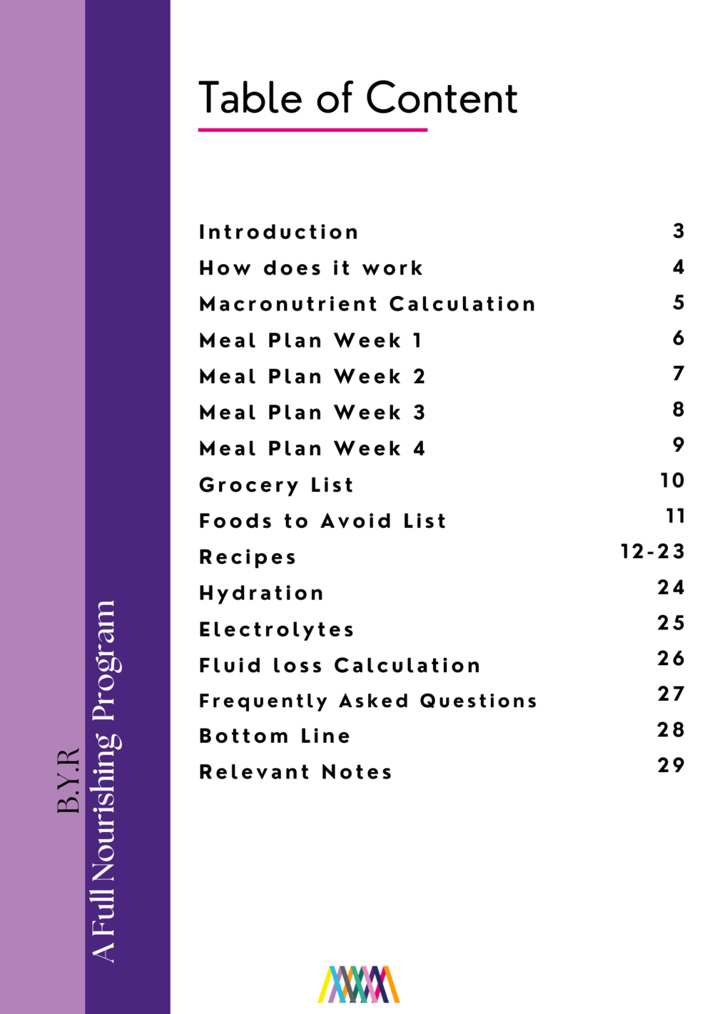 Complete 4-week menu (includes breakfast, lunch, dinner, pre and post-workout), Macronutrients calculator, Complete grocery list, Foods to avoid list, Recipes, Hydration Guide, Fluid Loss Calculator, Meal Prep Guide, Seasoning Blend Guide.